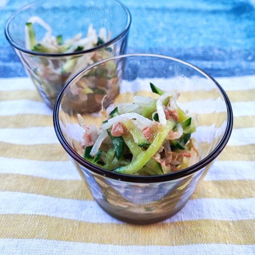 ① 1.もやしは耐熱ボウルに入れてラップをかけレンジで600w2分加熱します。加熱している間にきゅうりを千切りにします。