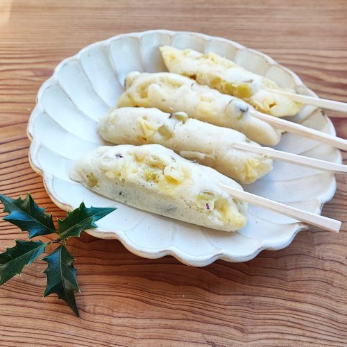 節分にぴったり!さつまいもの角切りがごろごろ入った鬼蒸しパンを棒状にして鬼の金棒風に蒸し上げました。カルシウム豊富なチーズも加えて子どものおやつにもおすすめ。甘みと塩気が後を引くおいしさです。