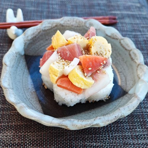 ⑤ 5. ご飯にすし酢を混ぜて冷まし、盛り付けて、4をのせ、いりごまをふります。
